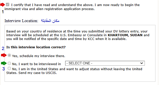 2- يجب تحديد مكان المقابلة إما الخيار الأول وهو تأكيد مكان المقابلة عند التقديم وكما في الصورة هو الخرطوم، أو الخيارالثاني لاختيار مكان مقابلة آخر، أما الخيار الثالث (3) فهو للمتواجدين داخل الولايات المتحدة الأمريكية.