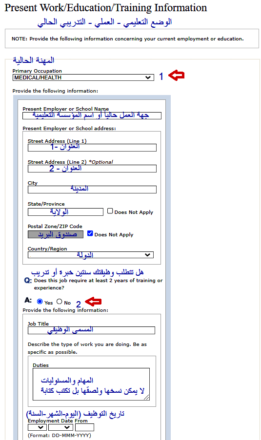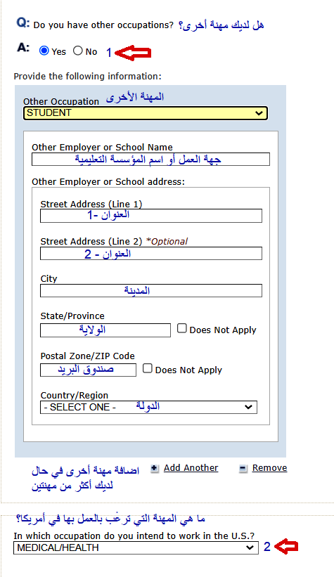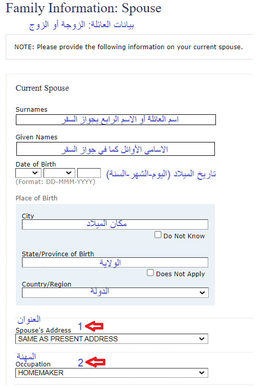2- يجب الانتباه أن مهنة الزوجة/الزوج هنا يجب أن تتطابق مع المهنة المذكورة بنموذج الدي اس الخاص بها/به