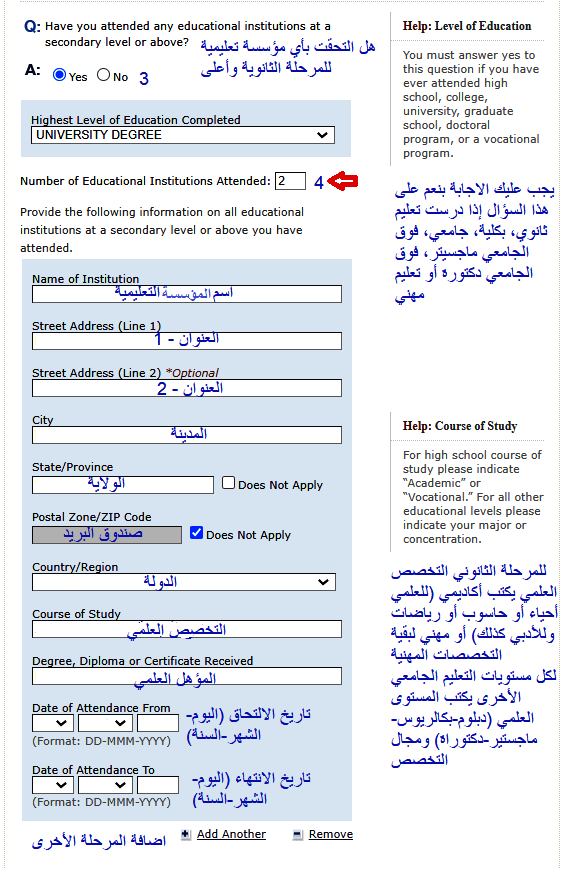 4- ادخال عدد المؤسسات التعليمية التي التحقت بها بدءاً من المرحلة الثانوية وأعلى ومثال على ذلك في حال أن أعلى مؤهل دراسي لديك بكالوريوس وسبق أن التحقت بمدرسة ثانوية ودرست بها 3 سنوات ثم جلست لامتحانات الشهادة السودانية، ثم بعد ذلك التحقت بالجامعة وتخرجت منها بمؤهل بكالوريوس ففي هذه الحالة يصبح عدد المؤسسات التعليمية 2 وهي المدرسة الثانوية والجامعة