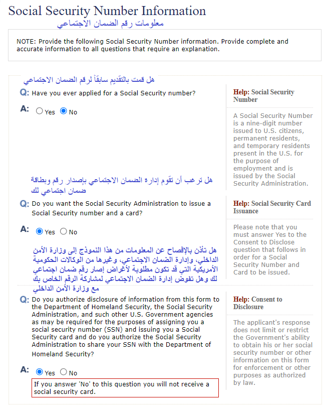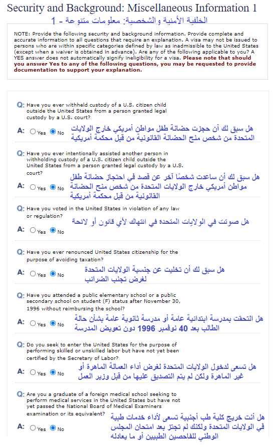 1- في حال عدم السفر لأمريكا سابقاً اختار (No) ولن تظهر لك بقية البيانات