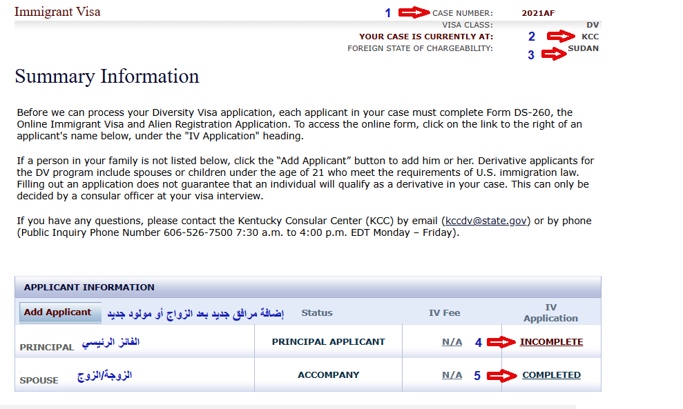 4 و 5 – تبين هذه القائمة أسامي الفائز الرئيسي والمرافقين (الزوجة/الزوج والأبناء) ومقابل كل أسم توجد حالة النموذج. عند دخول النموذج أول مرة ستكون الحالة (Start) ثم تتغير لكلمة (Incomplete) بعد البدء في التعبئة لتصبح (Completed) بعد التسليم، للدخول للنموذج الخاص بكل شخص يجب الضغط علي الكلمة المتواجدة في حال نموذج كل شخص.