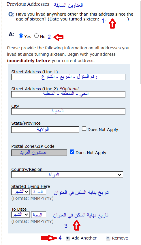 4- في حالة وجود أكثر من عنوان اقامة تختار (Add Another) وتدخل العنوان الأقدم تاريخياً من أخر عنوان أدخلته وتكرر هذه الخطوة