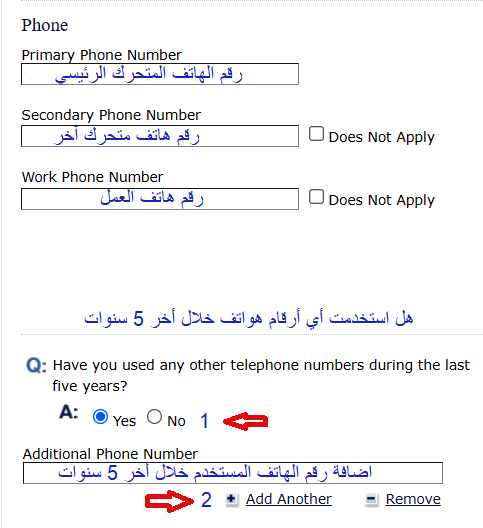 1- في حال استخدام رقم هاتف أخر خلال أخر 5 سنوات تختار (Yes) وتدخل رقم الهاتف المتحرك