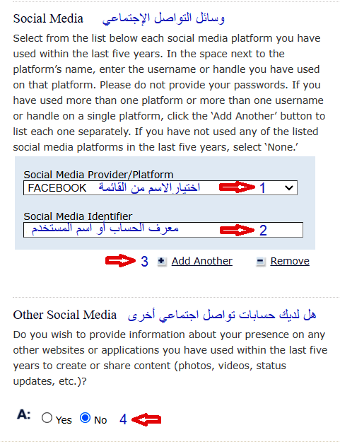 3- المطلوب جميع حسابات التواصل الإجتماعي في أخر 5 سنوات لذا اذا كان لديك حسابات أخرى في منصة واحدة أو منصات مختلفة يجب اختيار (Add Another) ثم تكرار نفس الطريقة