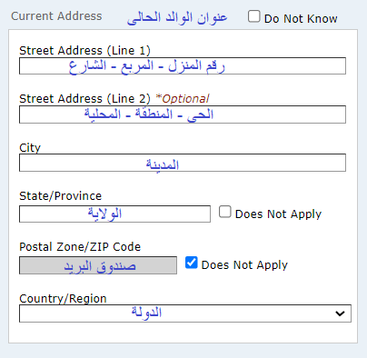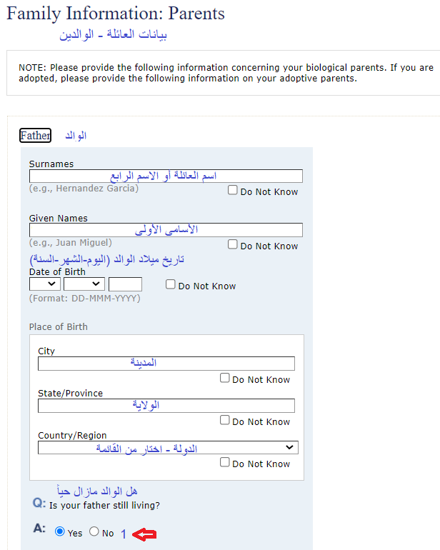 1- في حالة أن الوالد على قيد الحياة يتم اختيار (Yes) وادخال عنوان اقامة الوالد الحالي كما في الصورة التالية