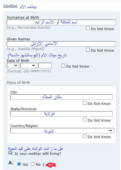 1- في حال أن الوالدة على قيد الحياة يتم اختيار (Yes) ويتم ادخال عنوان اقامة الوالدة الحالي كما في الصورة التالية