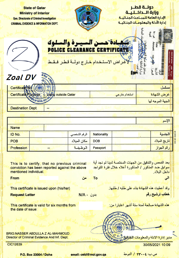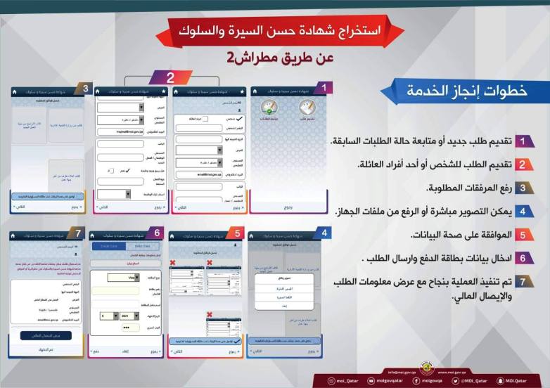 - إصدار شهادة حسن سير وسلوك من وزارة الداخلية القطرية (10 ريال قطري).