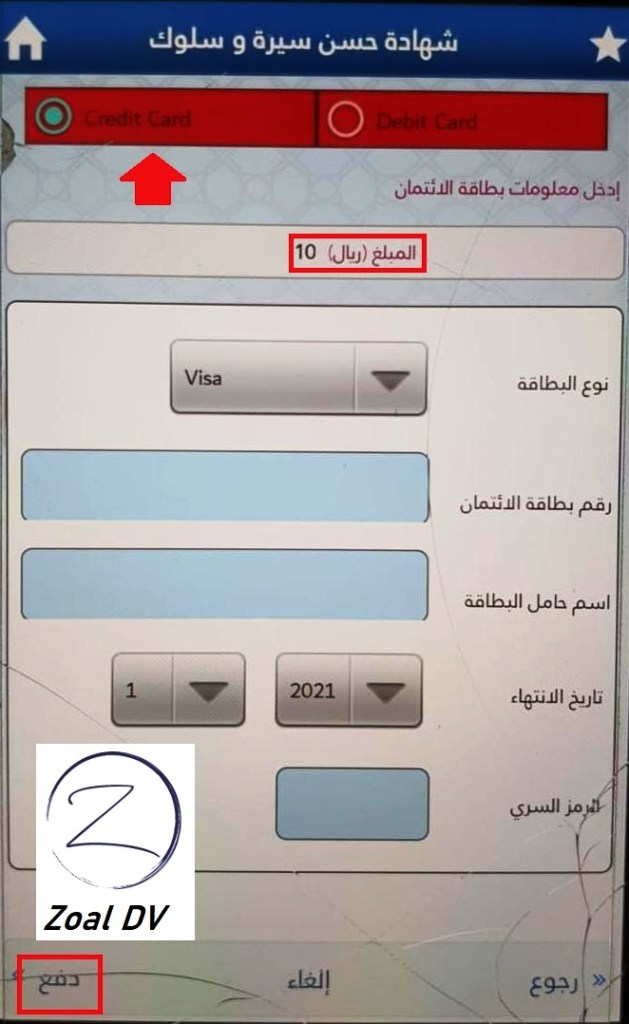 12- دفع رسوم استخراج الشهادة (10 ريال قطري للشخص الواحد)، اختيار نوع بطاقة الدفع (بطاقة بنكية أو بطاقة ائتمان) ثم ادخال رقم البطاقة واسم حامل البطاقة وتاريخ انتهاء البطاقة ثم الرمز السري وبعد ذلك الضغط على زر دفع.