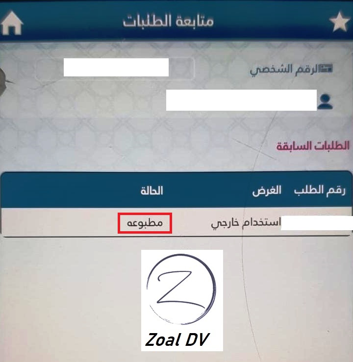 14- الاطلاع على حالة الطلب (مطبوعة) كما في المثال أدناه.