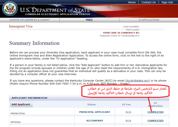من قائمة الأشخاص المنضمين لملف الهجرة (الفائز الرئيسي أو المرافقين) أختار كلمة (COMPLETED) المقابلة للشخص