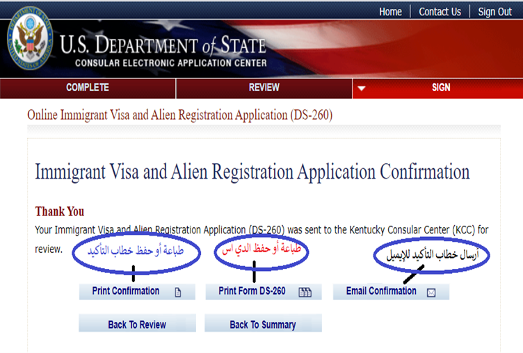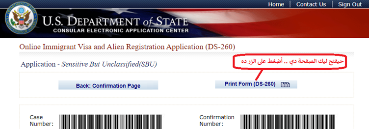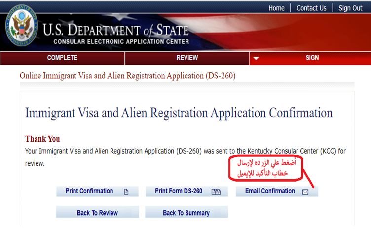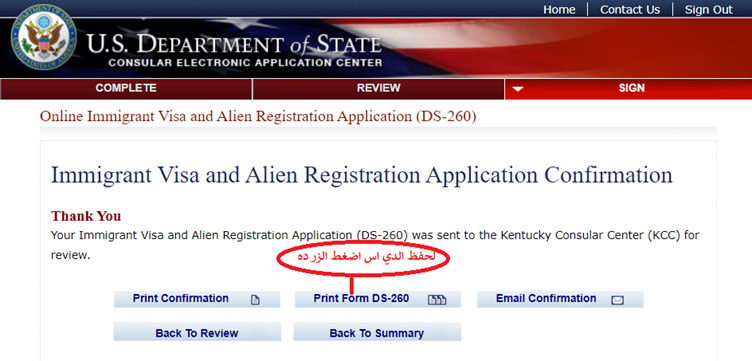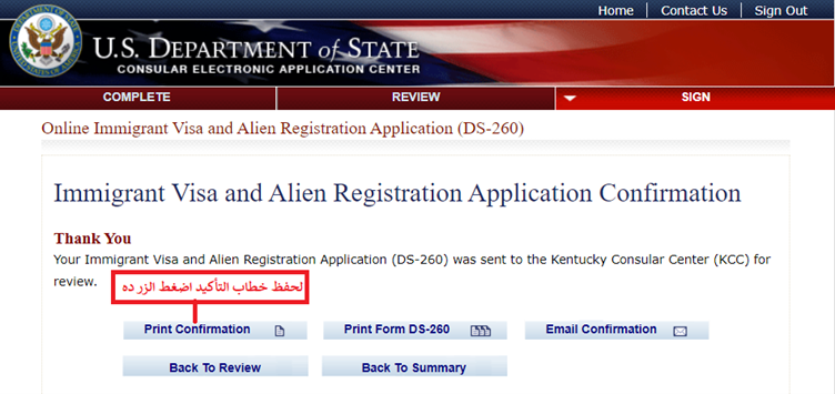 للدخول على صفحة طباعة أو حفظ نموذج (DS-260) وخطاب التأكيد (Confirmation Letter) وكذلك إرسال خطاب التأكيد للإيميل المسجل في النموذج أو أي إيميل إضافي آخريمكن الضغط عى رابط (Confirmation Page) بعد التسليم أسفل الصفحة على اليمين أو إتباع الخطوات المبينة بالصور أدناه