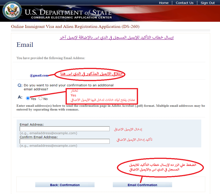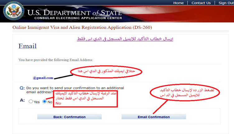 أولاً: إرسال خطاب التأكيد للإيميل المسجل في نموذج DS-260 فقط